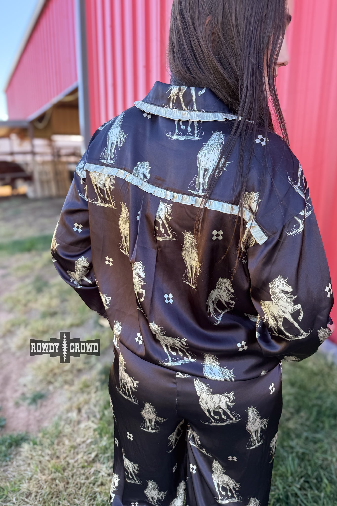 Meet your new favorite way to wind down- the Black Betty Satin Sleep Set. This silky-soft two-piece features an allover western horse print on a sleek black base with contrast trim and dainty tie details for that extra touch of charm. Lightweight, comfy, and made for lounging hard or sleeping easy, this set brings western flair straight to your bedtime routine.